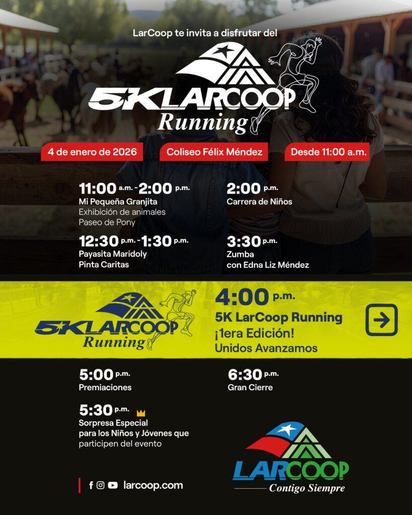 4:00 p.m.: Disparo de salida de nuestra 1era Edición del 5K LarCoop Running.