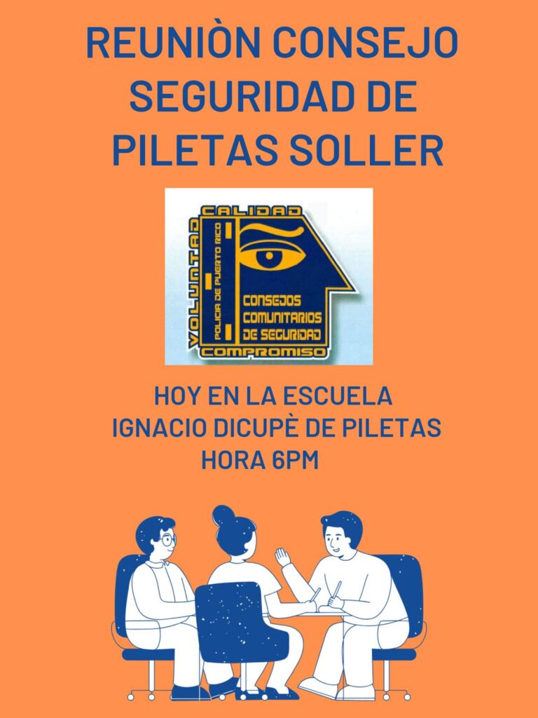 El alcalde Fabián “Faby” Arroyo Rodríguez invita a la comunidad de Piletas a que se den cita hoy desde las 6pm en la Escuela Ignacio Dicupé González donde se estará creando el nuevo Consejo de Seguridad de la comunidad de Piletas Soller. Además, se estarán discutiendo temas sobre el servicio de agua potable, la reparación de focos y los ruidos innecesarios.