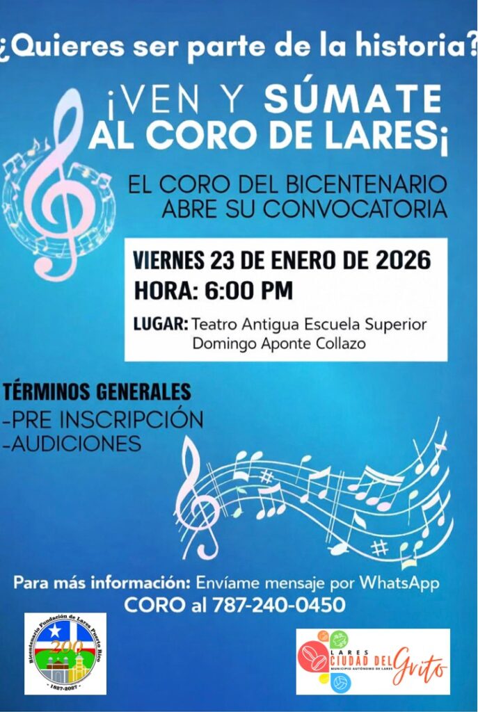 ¡Ven y súmate al Coro de Lares! El Coro del Bicentenario abre oficialmente su convocatoria e invita a todos los ciudadanos con pasión por el canto a formar parte de este importante proyecto cultural en celebración de los 200 años de Lares.