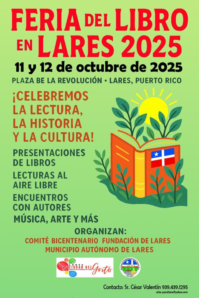 El Comité Bicentenario de la Fundación de Lares y el Municipio Autónomo de Lares, junto a su Alcalde Fabián Arroyo Rodríguez, te invitan a la Feria del Libro en Lares. Ven y celebra con nosotros la lectura, la historia y la cultura de nuestro pueblo. Te esperamos.