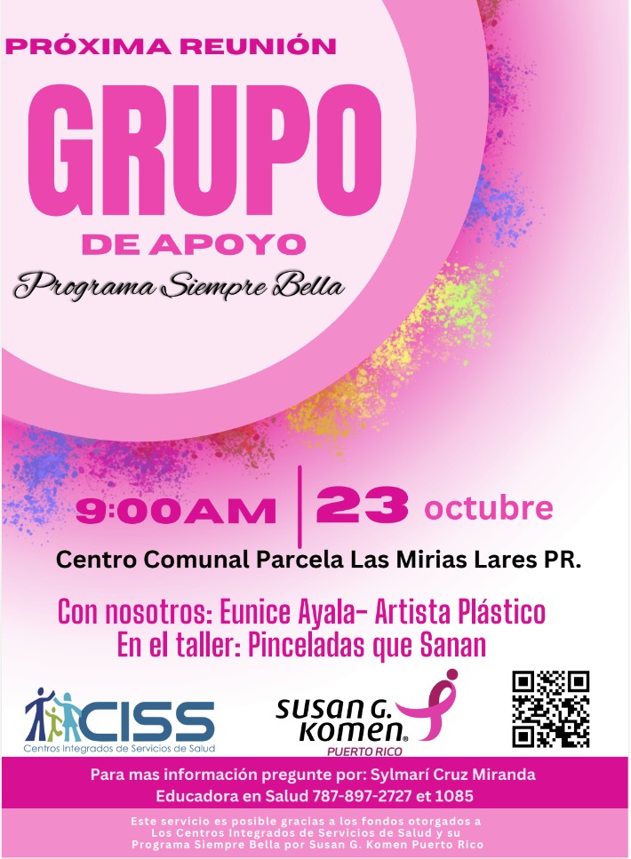 Comprometidos con la salud de la mujer de nuestras comunidades y en apoyo al Programa Siempre Bella, te invitamos a reunirnos en el Grupo de Apoyo este 23 de octubre.