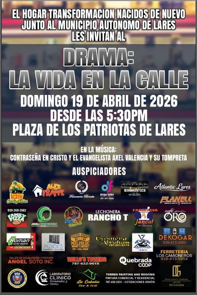 El alcalde Fabián “Faby” Arroyo Rodríguez y el Hogar Transformación Nacidos de Nuevo te invitan este próximo domingo 19 de abril de 2026 al drama “La Vida en la Calle.