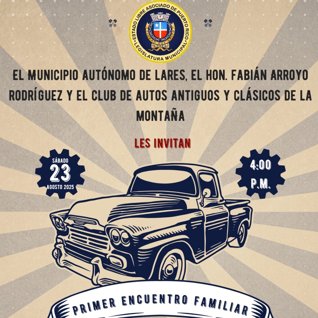 ¡Atención amantes de los autos clásicos y antiguos! El alcalde Fabián “Faby” Arroyo Rodríguez y el Club Autos Antiguos y Clásicos de la Montaña te invitan al Primer Encuentro de Autos Clásicos y Antiguos en la Ciudad del Grito. Fecha: Viernes, 23 de agosto Hora: 4:00 p.m. Lugar: Plaza de los Patriotas, Lares Ven y […]