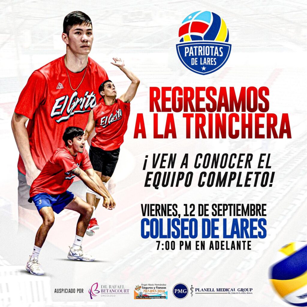 Lareño, este domingo 14 de septiembre, nuestros Patriotas de Lares reciben a los Plataneros de Corozal en la serie semifinal de la Liga Puertorriqueña de Voleibol Masculino 2025. Los boletos estarán disponibles en la boletería del coliseo desde las 5:30 PM.El juego comienza a las 6:30 PM.