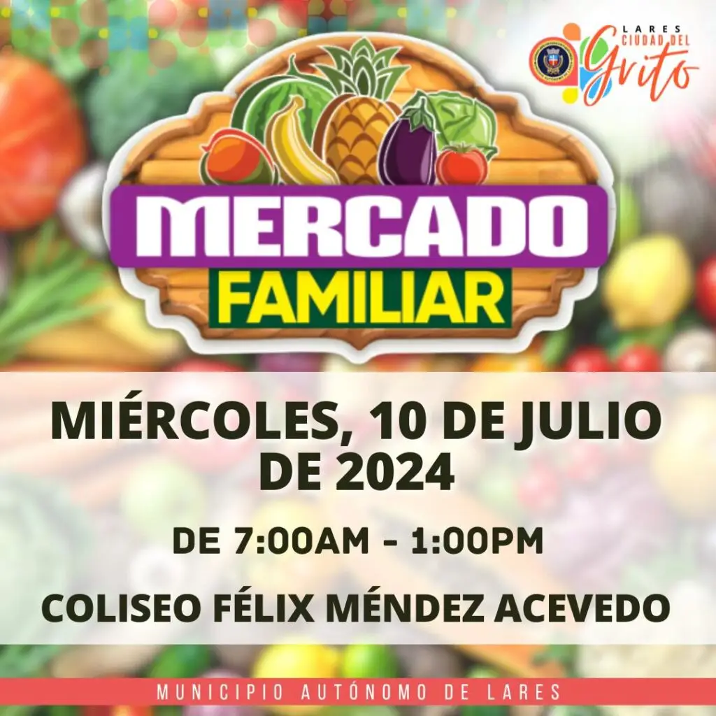 La Administración Municipal te invita al Mercado Familiar el miércoles, 10 de julio de 2024 de 7:00am a 1:00pm en el Coliseo Félix Méndez Acevedo. Se estarán entregando vales de $40 para adultos de 60 años o más.Apoyemos el comercio local de nuestra #CiudaddelGrito.