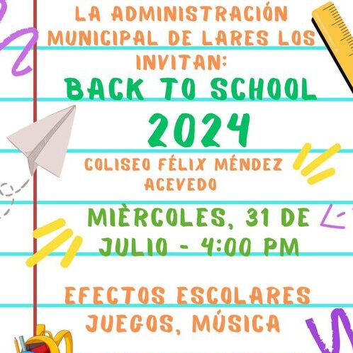 La Administración Municipal te invita el mièrcoles, 31 de julio de 2024 al “Back to School” en el Coliseo Félix Méndez Acevedo desde las 4:00p.m donde se estarán entregando efectos escolares a todos los niños y jóvenes de nuestra Ciudad del Grito.