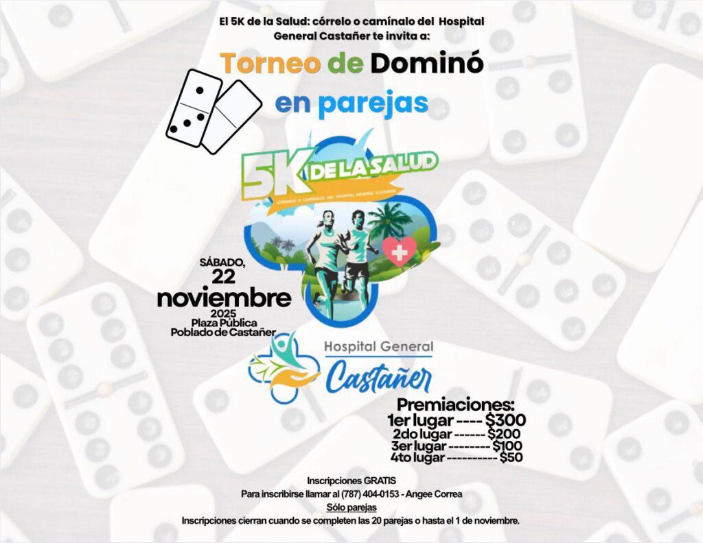 ¡Torneo de Dominó en Parejas! El Hospital General Castañer te invita a participar del Torneo de Dominó en Parejas como parte del evento 5K de la Salud. Inscripciones gratis Para inscribirte, llama al (787) 404-0153 (Angee Correa) Solo para parejas — Inscripciones abiertas hasta completar 20 parejas o hasta el 1 de noviembre. ¡Participa y […]