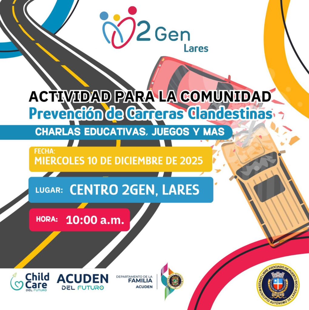 Este miércoles, 10 de diciembre de 2025, te invitamos al Centro 2Gen Lares para participar de nuestra Actividad Comunitaria sobre la Prevención de Carreras Clandestinas.