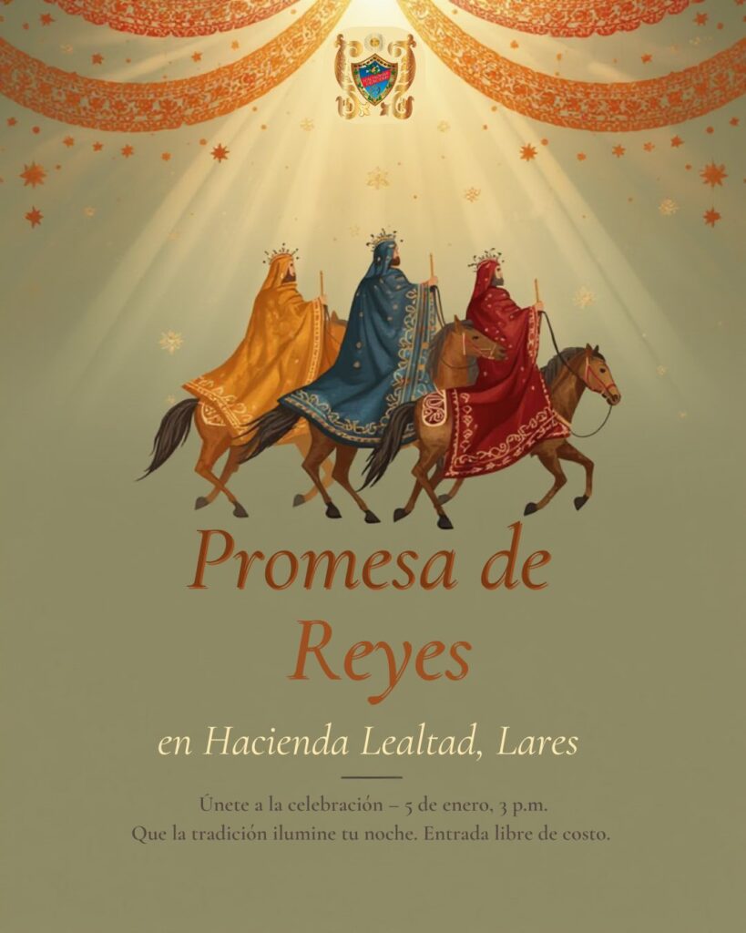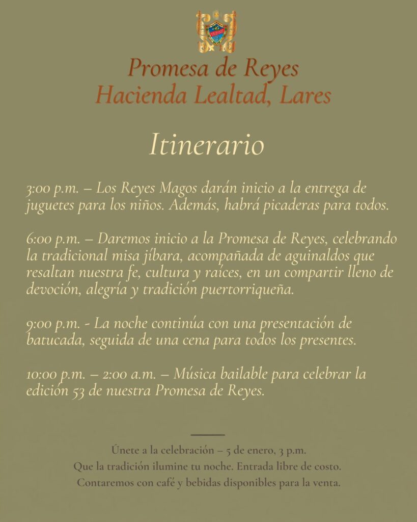 Con profundo respeto y cariño, les invitamos a acompañarnos en nuestra Promesa de Reyes en la Hacienda, una celebración llena de fe, música y tradición puertorriqueña. Será un espacio para honrar a los Reyes Magos, celebrar la Epifanía (nacimiento de Jesús), recordar a Papito y compartir juntos una noche especial que nace del corazón y de nuestras raíces.