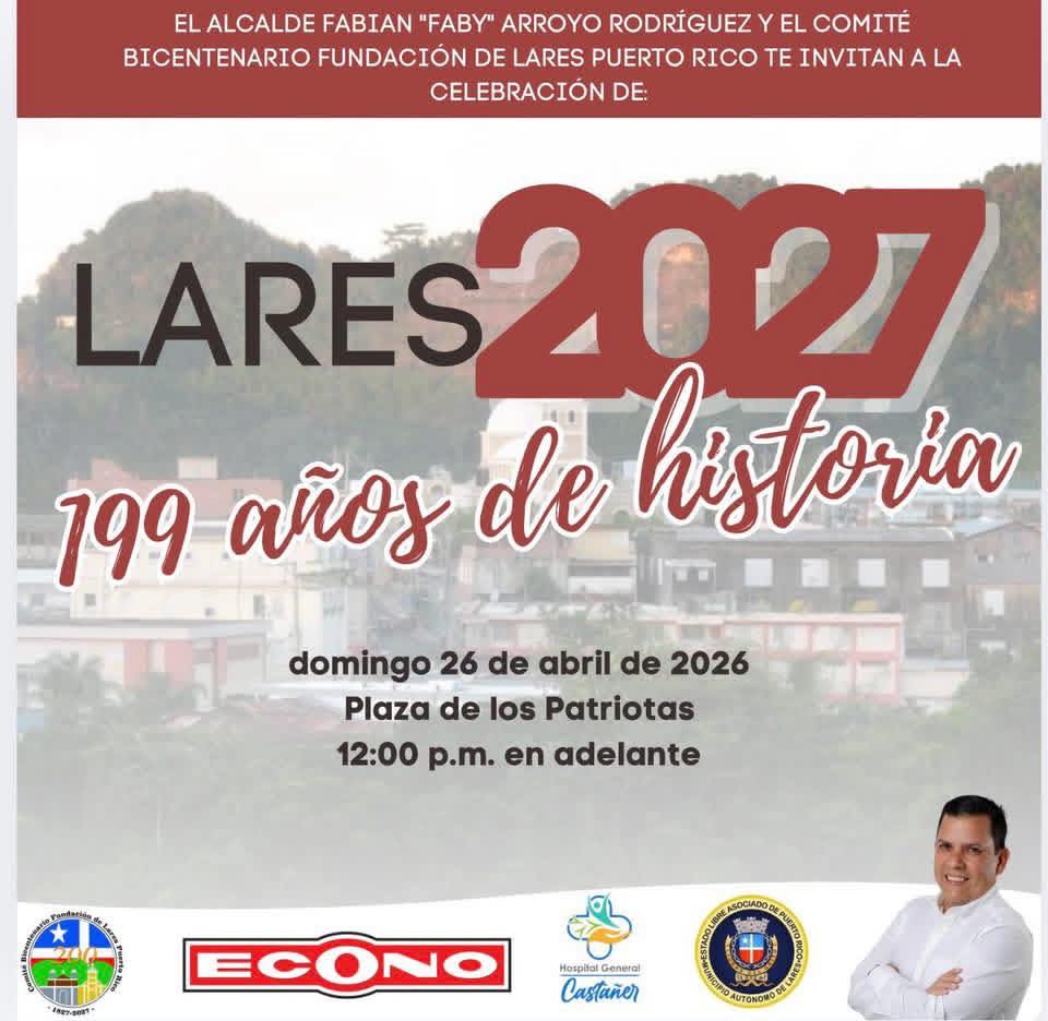 El alcalde Fabián “Faby” Arroyo Rodríguez y el Comité Bicentenario Fundación de Lares te invitan a que seas parte de la celebración de los 199 años de fundación e historia de nuestra Ciudad del Grito.
