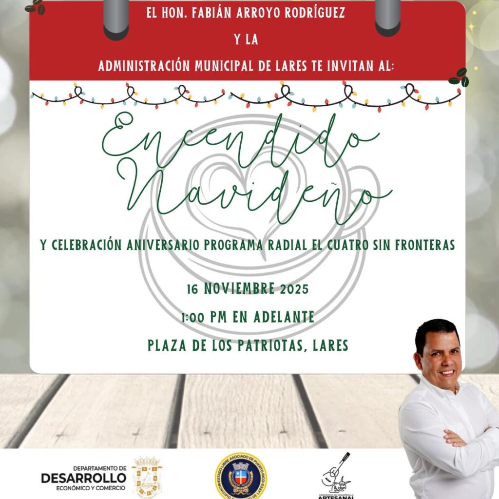¡La Navidad en Lares huele a café! El Hon. Fabián Arroyo Rodríguez y la Administración Municipal de Lares te invitan a disfrutar de nuestro tradicional Encendido Navideño, que este año se celebra junto al 15.º Aniversario del programa radial El Cuatro sin Fronteras. Ven a compartir una tarde llena de alegría, música, artesanías, comida típica […]