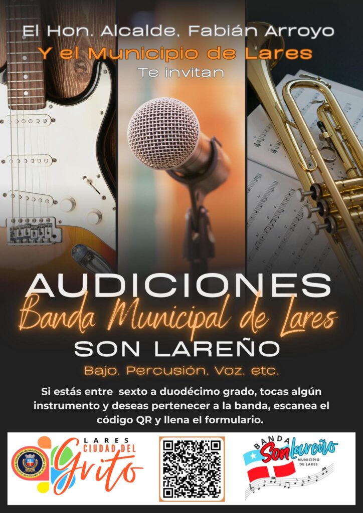 El alcalde Fabián “Faby” Arroyo Rodríguez invita a todo aquel estudiante entre sexto a duodécimo grado a ser parte de la Banda Municipal – Son Lareño. Durante el mes de marzo se llevarán a cabo las audiciones.